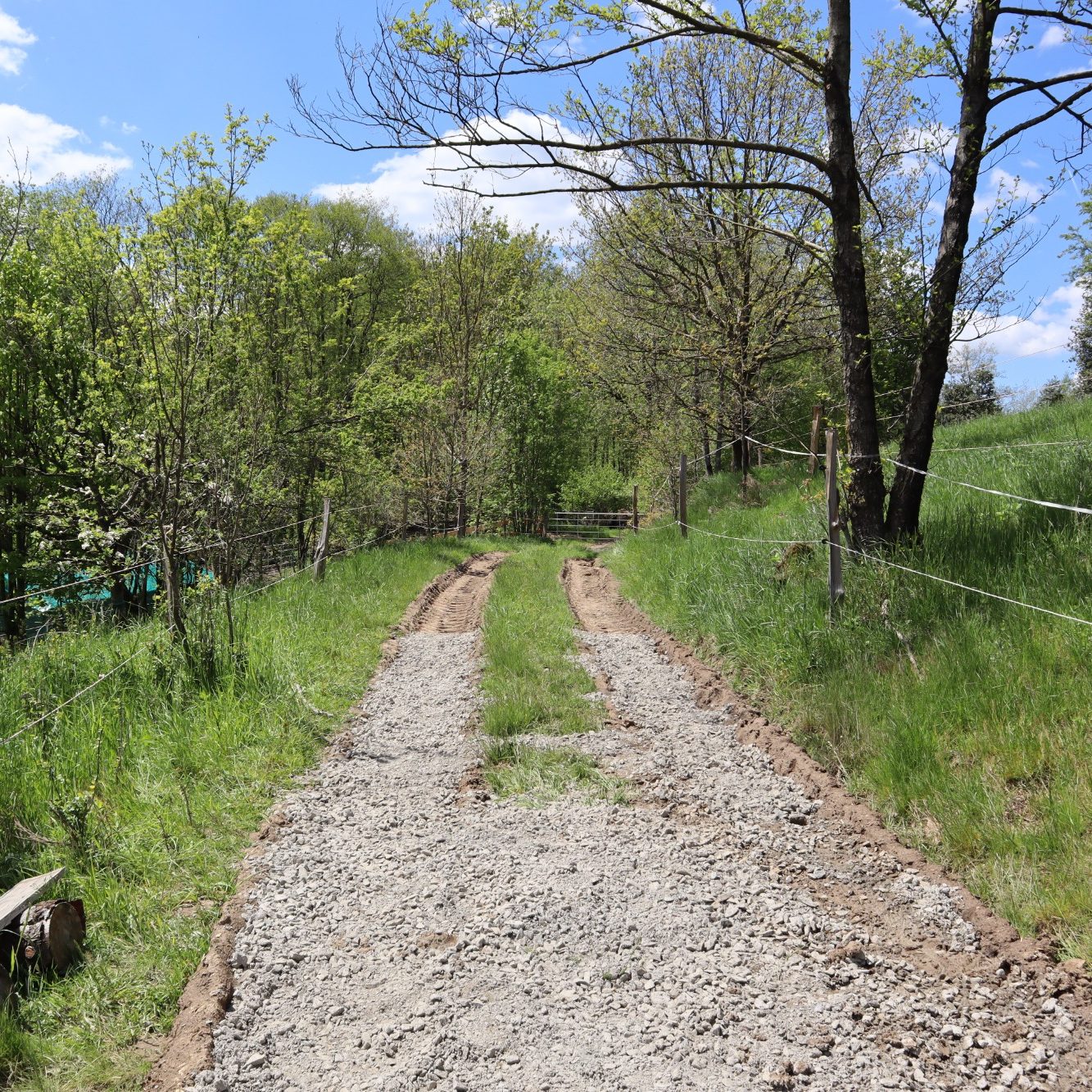 Im befestigten Offenstall werden ganzjährig Heu aus eigener Produktion und Futterstroh den Pferden angeboten und sie finden Ruhe in den Weidezelten. Den Trail hinauf geht es entlang einer naturbewachsenen Böschung und der Tränke zum geräumigen und drainierten Paddock mit Naturboden und Hackschnitzeln, der auch als kleiner Reit-/Longierplatz genutzt wird.